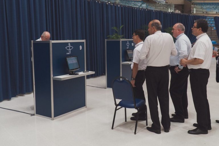 O processo de votação – Para votar, cada bispo deverá se dirigir até o secretário da seção eleitoral. Assinada a lista de votação, o eleitor deverá entregar ao presidente sua Carteira de Identificação Episcopal para validação e liberação da urna de votação. A carteira será posicionada sobre um leitor de cartão por rádio frequência, para que seja feita a leitura digital da matrícula.