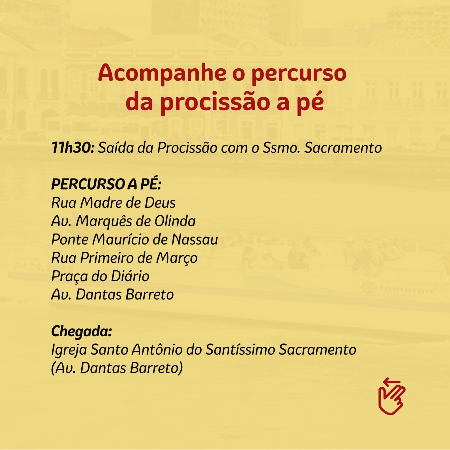 A procissão com o Santíssimo Sacramento será apenas pelas ruas próximas. Após o término da solenidade, percorrerá a Avenida Marquês de Olinda, Ponte Maurício de Nassau, Rua 1º de Março, Praça do Diário e Avenida Dantas Barreto, até a Igreja Santo Antônio do Santíssimo Sacramento, para a benção final.