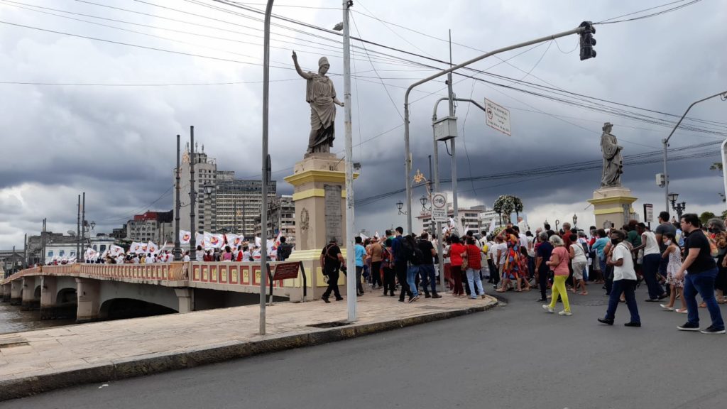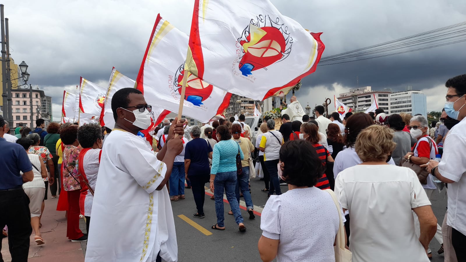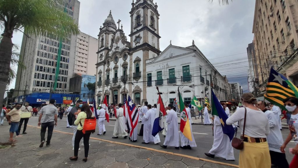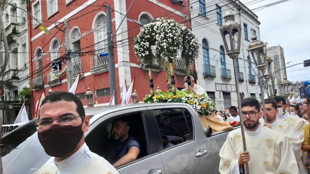 O povo sentiu de verdade o clima de congresso eucarístico. Ali, o corpo de Cristo estava exposto no ostensório que foi usado no 3º Congresso Eucarístico Nacional, que aconteceu em 1939 no Recife. Uma peça histórica para um momento significativo, que reuniu fiéis pelas ruas da cidade em procissão. Sobre um carro, com dom Fernando, o Santíssimo atravessou a ponte Maurício de Nassau, ladeado por bandeiras que acenavam sua passagem, já com a logo do congresso deste ano. O céu ameaçou, mas não houve chuva. À frente do cortejo estavam as bandeiras das unidades federativas, representando a união dos estados brasileiros no propósito da realização do Congresso Eucarístico. Descendo a ponte, a procissão passou em frente à chamada Casa do Pão, um prédio de três pisos que está sendo preparado para ser o marco do 18º CEN e que atenderá a população de rua com alimentação, banho, lavanderia, qualificação profissional, além de acompanhamento jurídico, psicológico e espiritual.