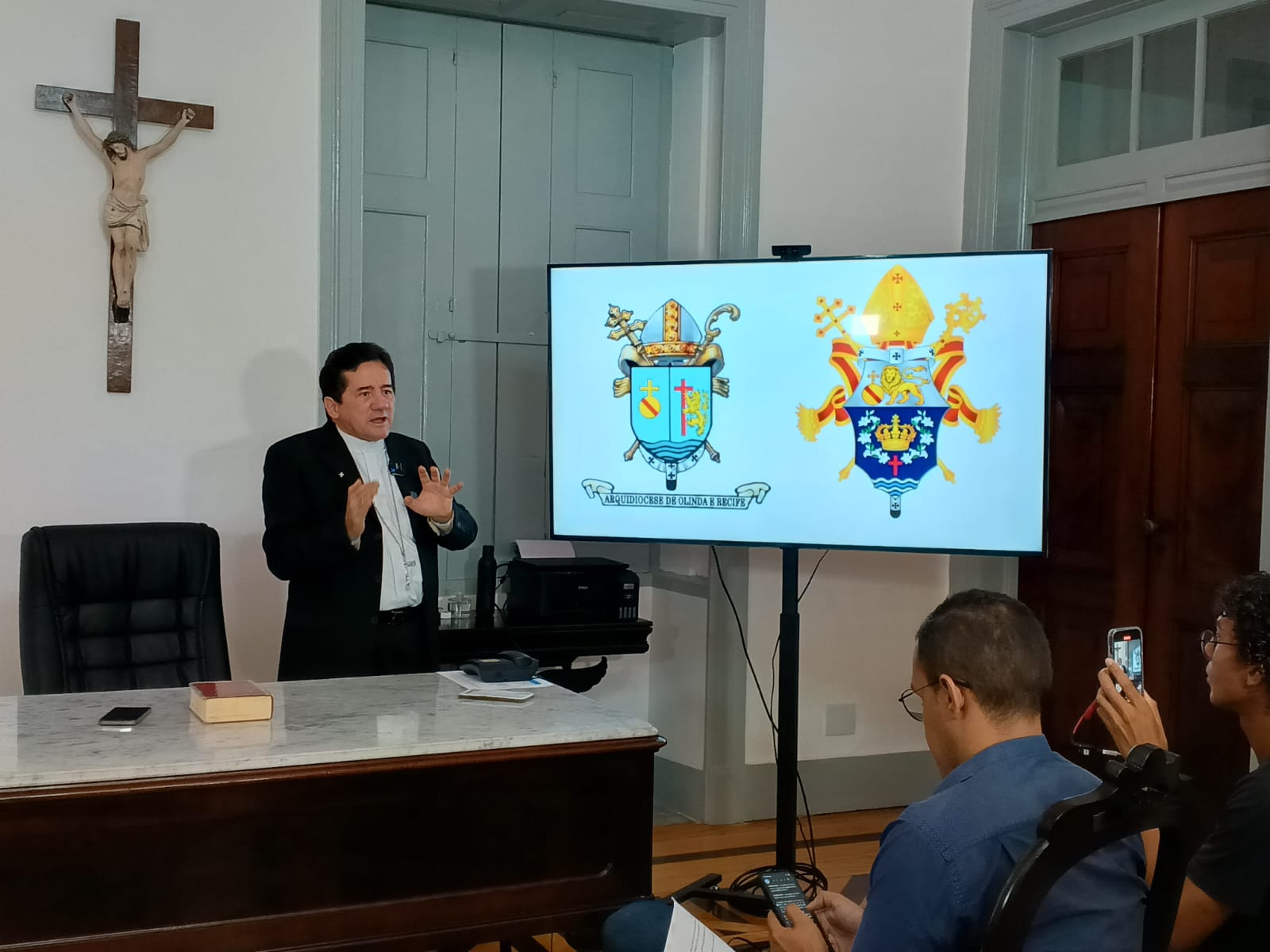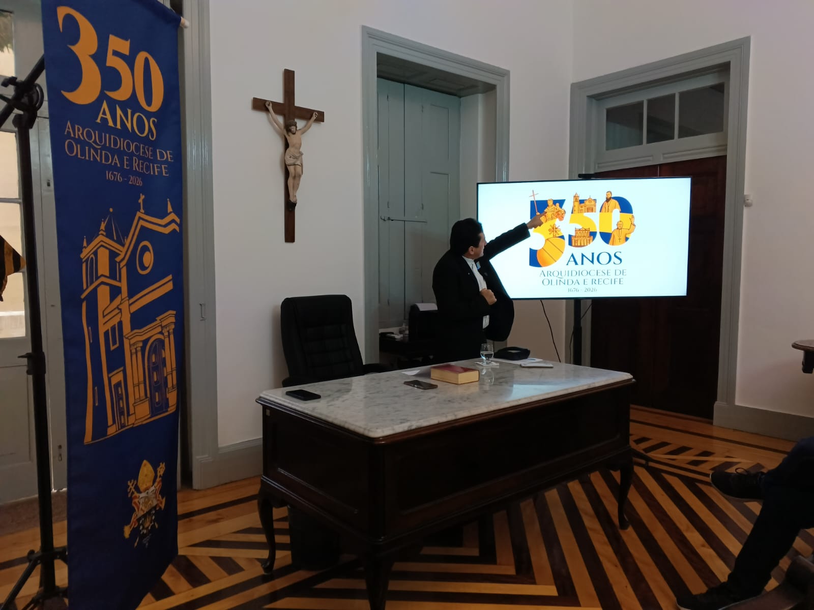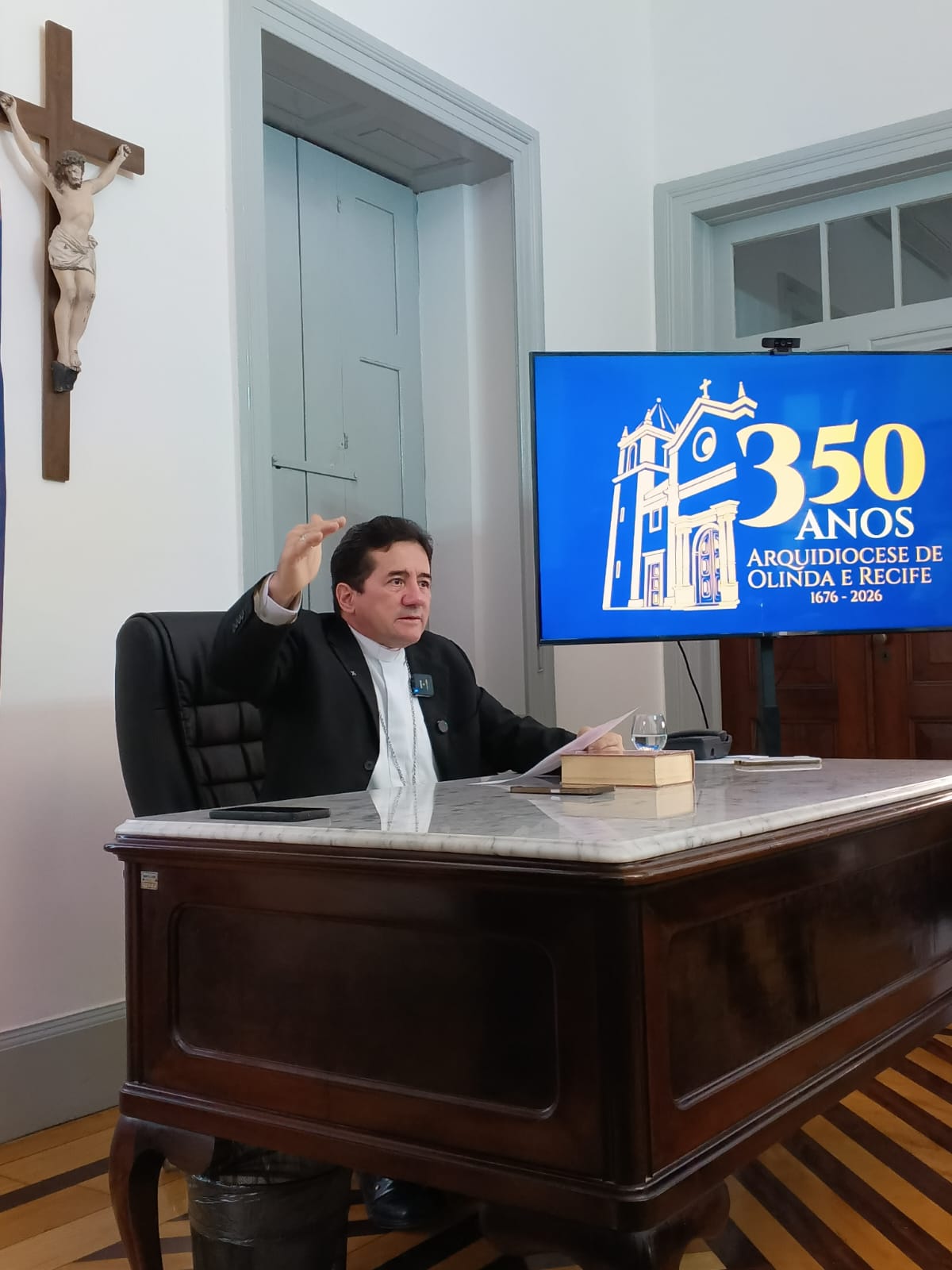 Em coletiva realizada nesta quinta-feira (13), o arcebispo de Olinda e Recife, dom Paulo Jackson, apresentou a programação que vai comemorar, a partir deste domingo (16), os 350 anos da Arquidiocese de Olinda e Recife, que nasceu como Diocese de Olinda em 1676. Como parte da programação celebrativa, o arcebispo apresentou o logo comemorativo dos 300 anos e o novo brasão da Arquidiocese de Olinda e Recife, que contempla elementos como o mar, Jesus Cristo, Maria Mãe de Deus, o arcebispado, Olinda, Recife e outras representações.