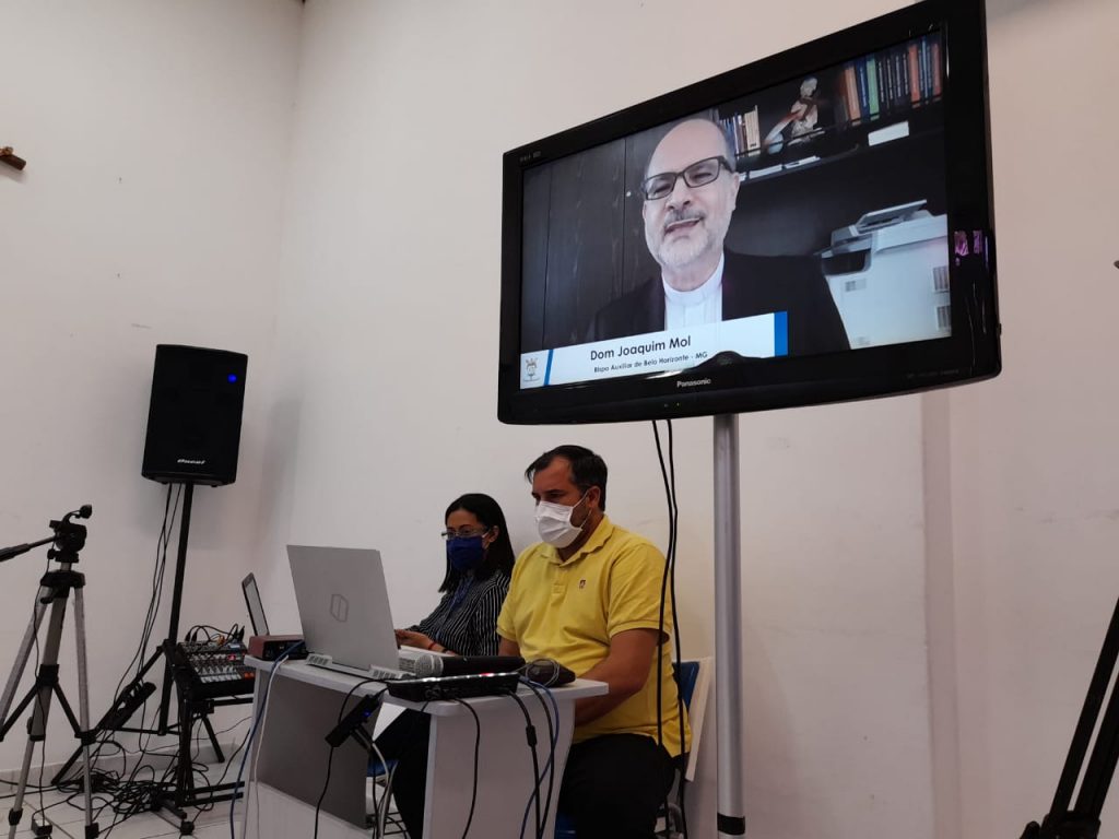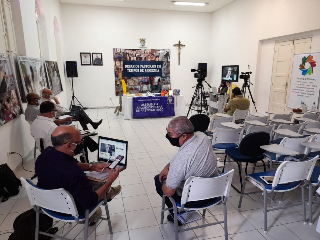 A base de transmissão da Assembleia foi o auditório da Cúria Metropolitana, no bairro das Graças, no Recife. De lá, três câmeras conectadas à plataforma vMix mostravam a participação do arcebispo dom Fernando, do bispo auxiliar dom Limacêdo, do coordenador arquidiocesano de pastorais padre Josenildo, dos diáconos Sérgio e Sandro e da secretária Ane Kely. Convidado a participar direto de Belo Horizonte, onde é bispo auxiliar da Arquidiocese, o bispo dom Joaquim Mol fez uma reflexão sobre o tema “Desafios pastorais em tempo de pandemia”. De forma iluminada, dom Mol afirmou que a Igreja precisa ser mais espiritual, querigmática (colocando Jesus no centro de seu existir), catequética e misericordiosa.