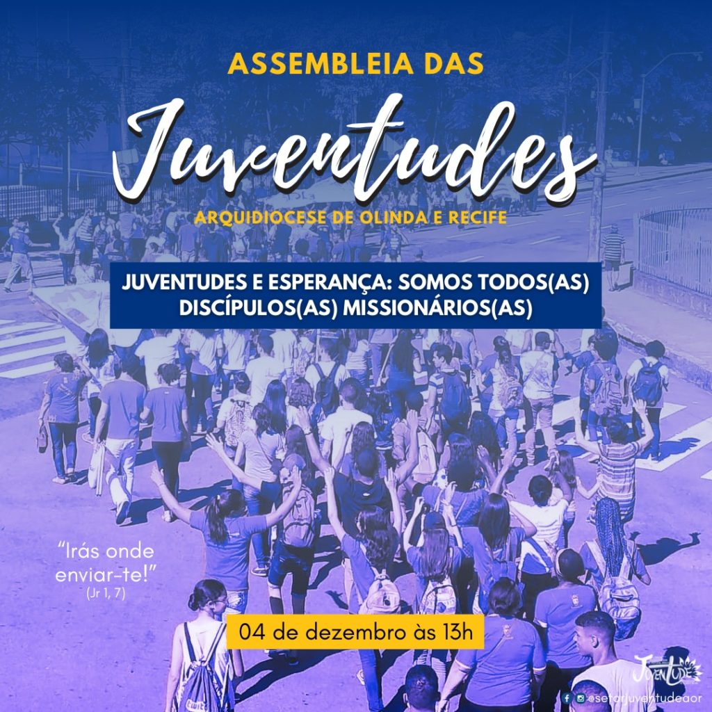 A Comissão Arquidiocesana de Pastoral para as Juventude (CAP Juventudes) promove, no dia 4 de dezembro, das 13h às 17h, a Assembleia Arquidiocesana das Juventudes de 2021. O encontro tem como público-alvo expressões juvenis, comissões vicariais padres, religiosos e assessores que trabalham com os jovens nas paróquias, colégios, novas comunidades e pastorais. O evento será realizado no auditório e na capela do Colégio São José, no Recife, com a temática: “Juventudes e Esperança: Somos todos/as Discípulos/as Missionários/as!”.