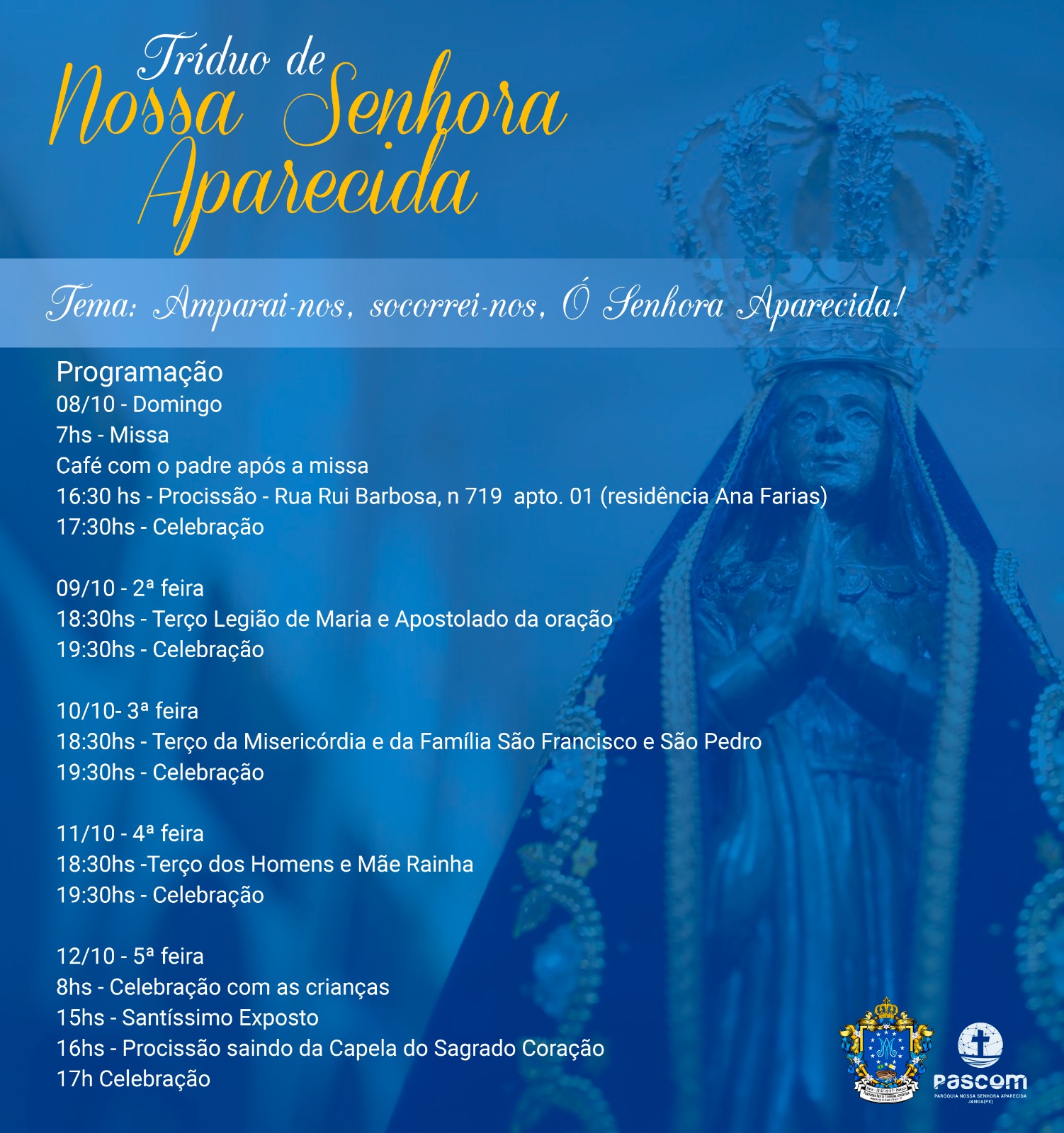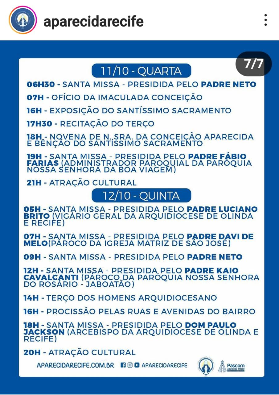 No próximo dia 12 de outubro, Nossa Senhora Aparecida, padroeira do Brasil, será homenageada na arquidiocese em várias paróquias. A maior delas será na Paróquia Nossa Senhora Aparecida, no IPSEP, com programação marcada para iniciar às 5h da manhã, com quatro celebrações eucarísticas e procissão. A missa de encerramento será às 18h presidida pelo arcebispo dom Paulo Jackson, após a celebração terá show cultural.