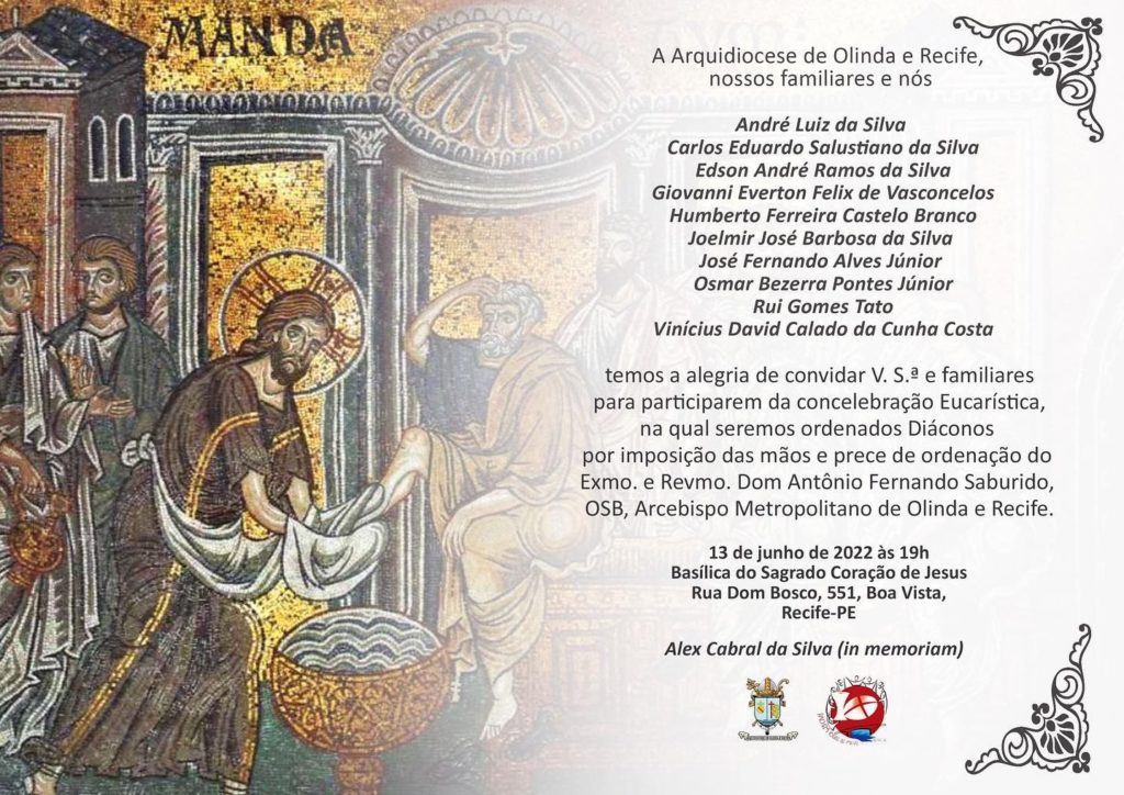 André Luiz da Silva, Carlos Eduardo Salustiano da Silva, Edson André Ramos da Silva, Giovanni Everton Felix de Vasconcelos, Humberto Ferreira Castelo Branco, Joelmir José Barbosa da Silva, José Fernandes Alves Júnior, Osmar Bezerra Pontes Júnior, Rui Gomes Tato e Vinícius David Calado da Cunha Costa receberão o Sacramento da Ordem em 1º (diaconato) pela imposição de mãos e prece consecratória do arcebispo de Olinda e Recife, dom Fernando Saburido.