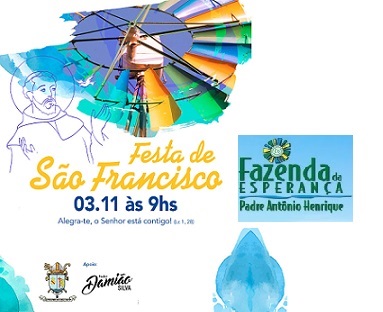 A Fazenda da Esperança padre Antônio Henrique, em Muribequinha, Jaboatão, convida para a festa de São Francisco, que será celebrada em 03/11 (9h). O tema da festa é “Alegra-te, o Senhor está contigo”. Na ocasião, o arcebispo de Olinda e Recife, dom Fernando Saburido, vai presidir uma Missaem Ação de Graças às 15h, na capela provisória da unidade e participará da inauguração da 3ª casa da Fazenda da Esperança Padre Antônio Henrique.