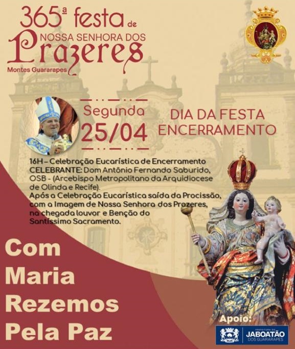 O povo celebra, de 17 a 25 de abril, a Festa de Nossa Senhora dos Prazeres, nos Montes Guararapes, com o tema “Com Maria rezemos pela paz”. Este ano, a festa chega à sua 365ª edição.