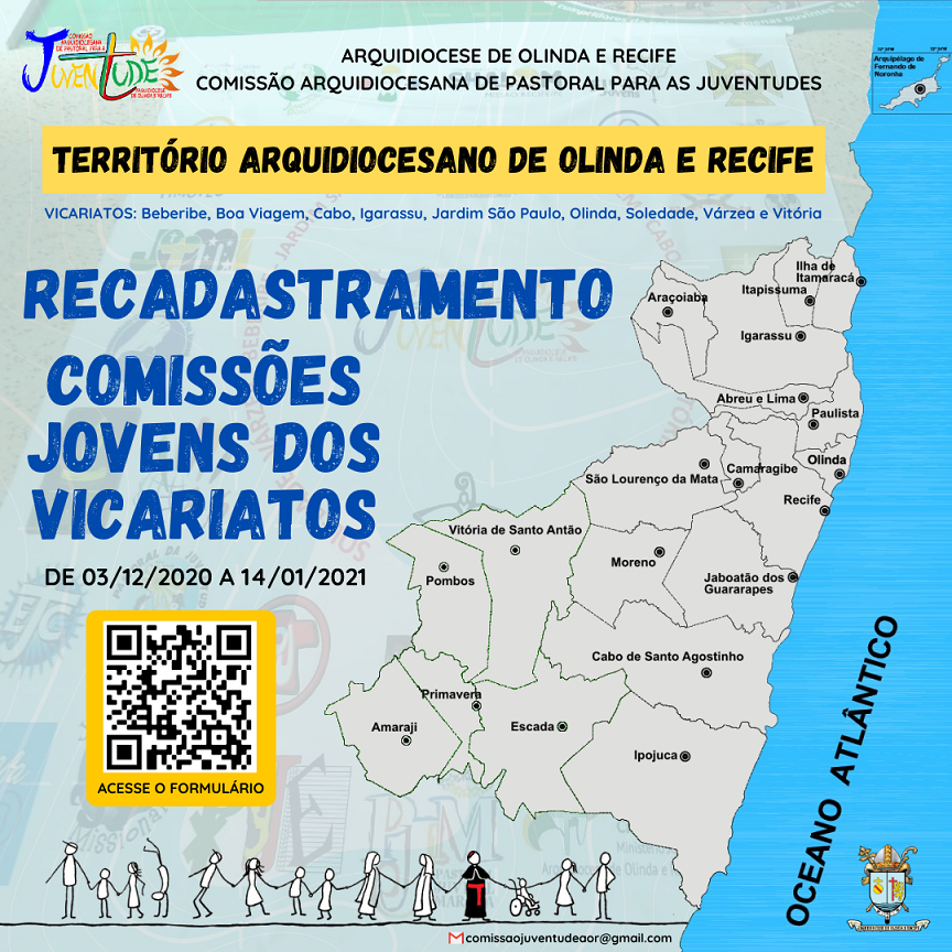 A Comissão Arquidiocesana de Pastoral para as Juventudes de Olinda e Recife encontra-se no processo de reorganização. Por isso realizará o mapeamento e recadastramento das Expressões Juvenis e Comissões Jovens dos Vicariatos, presentes no território Arquidiocesano de Olinda e Recife.