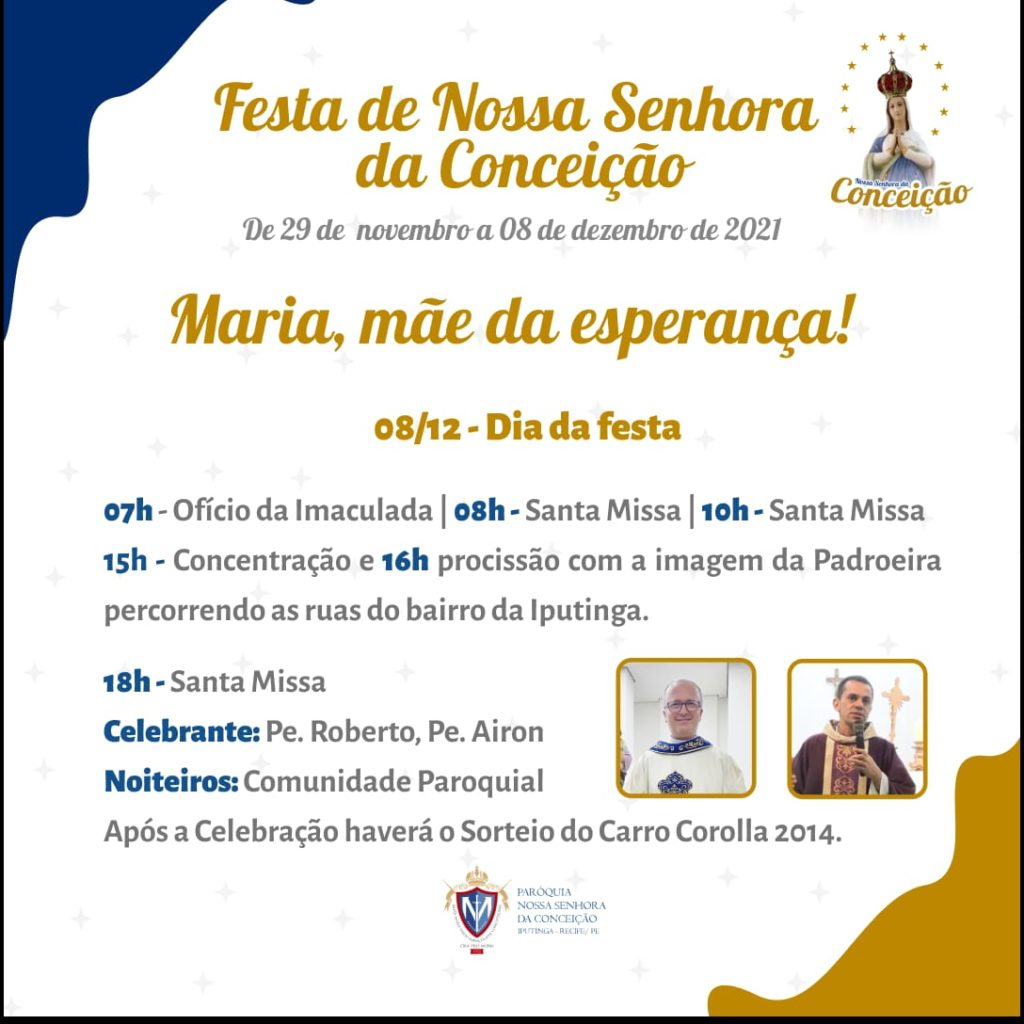 Algumas paróquias, como a da Iputinga, fizeram contagem regressiva para a festa, usando as redes sociais para envolver os fiéis no tema “Maria, mãe da Esperança!”. A Pastoral da Comunicação (Pascom) apostou nas facilidades da mídia para divulgar a música tema da festa e para convidar os fiéis para o novenário. “Até os ensaios dos cantos das missas e da novena foram feitos em lives, para que as pessoas cheguem na igreja e façam uma bonita festa para Nossa Senhora da Conceição”, explicou um dos coordenadores de Pascom do Vicariato Várzea, Robsom Nascimento, que é paroquiano e membro da Pascom Iputinga.