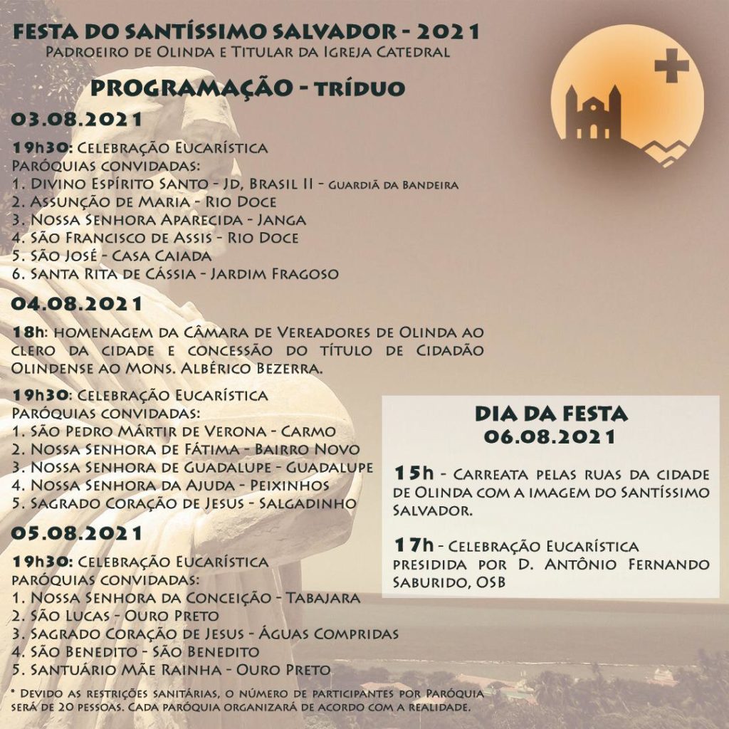 O tríduo em honra ao Santíssimo Salvador acontecerá nos dias 3, 4 e 5 de agosto, com missas às 19h30 na catedral. Devido às restrições sanitárias, será observado o número de pessoas dentro da igreja. “Vamos louvar ao Senhor com alegria, mas com muito cuidado, prezando pela vida que Ele mesmo nos deu”, disse o monsenhor Albérico, cura da catedral. “Por isso, convidamos as paróquias do Vicariato Olinda, organizando sua participação: a cada noite do tríduo, cinco paróquias estarão presentes com número máximo de 20 pessoas cada, representando a comunidade paroquial”, explicou.