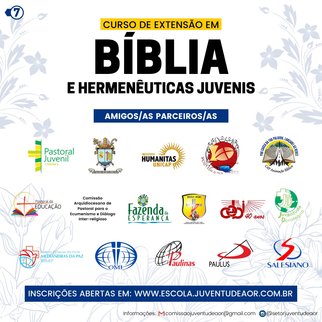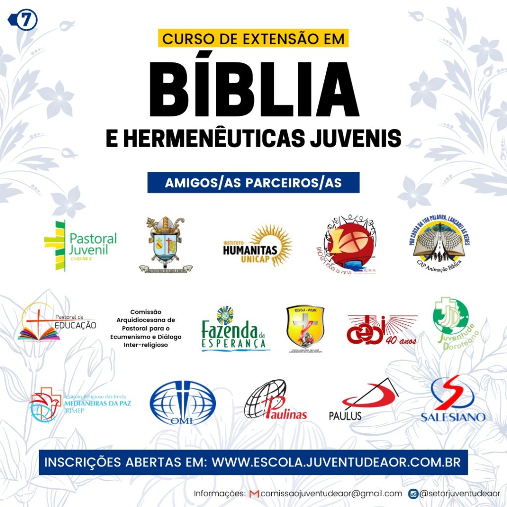 A Comissão Arquidiocesana de Pastoral (CAP) para a Juventude da Arquidiocese de Olinda e Recife inicia a 3ª edição da Escola de Formação das Juventudes Pe. Antônio Henrique com um curso online sobre Bíblia e Hermenêuticas Juvenis que será oferecido de abril a julho de 2022 pela plataforma Google Meet. O curso tem carga horária total de 55 horas, com certificado fornecido pelo Instituto Humanitas da Universidade Católica de Pernambuco (Unicap) como curso de extensão.