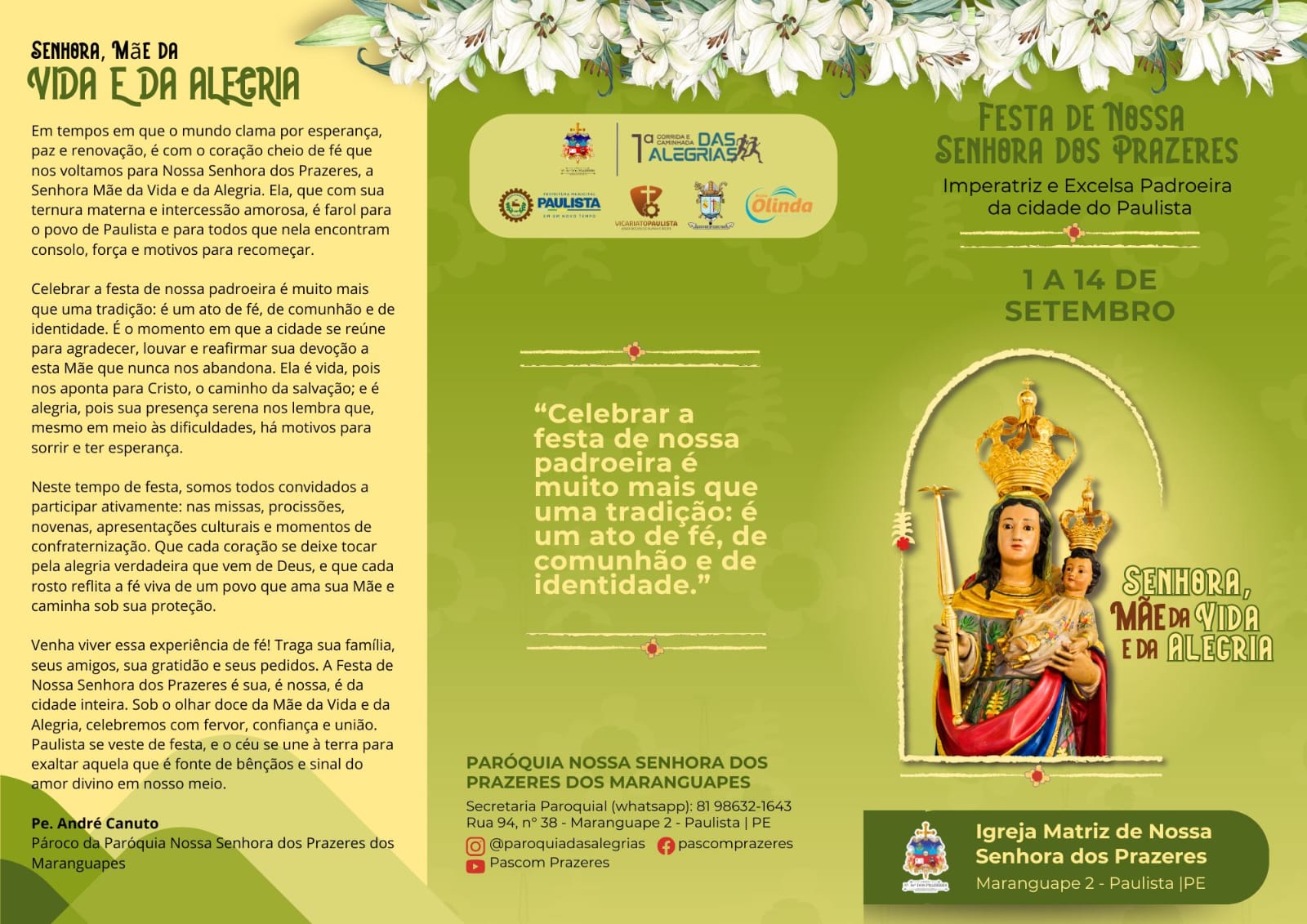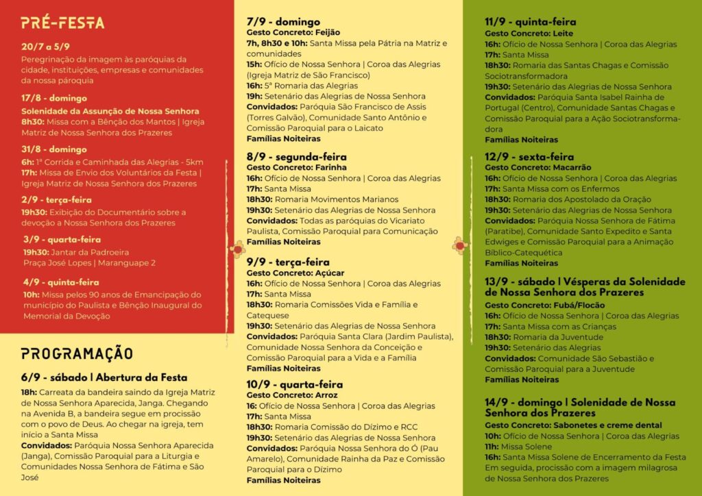 A cidade do Paulista viverá intensamente a Festa de Nossa Senhora dos Prazeres, padroeira do município, reverenciada há mais de quatro séculos. Este ano, o tema “Senhora, Mãe da Vida e da Alegria” guiará uma programação que une fé, cultura, esporte e música, também em homenagem aos 90 anos de emancipação da cidade.